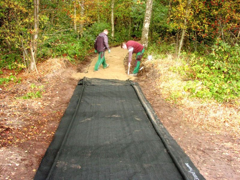 Um den Forstweg zu sanieren, wurde ein dreischichtiger Aufbau gewählt: zunächst wurde der Weg bis zur Tragschicht, die bestehen bleiben konnte, ausgekoffert. Anschließend wurde der Untergrund ausgeglichen, stabilisiert und verdichtet. Dann folgten der Einbau von HanseMineral® als dynamischer Zwischenschicht in einer Stärke von 6 cm und darauf dann Stabilizer mixed HanseGrand® Robust Donau beige in einer Körnung von 0-11 mm.
